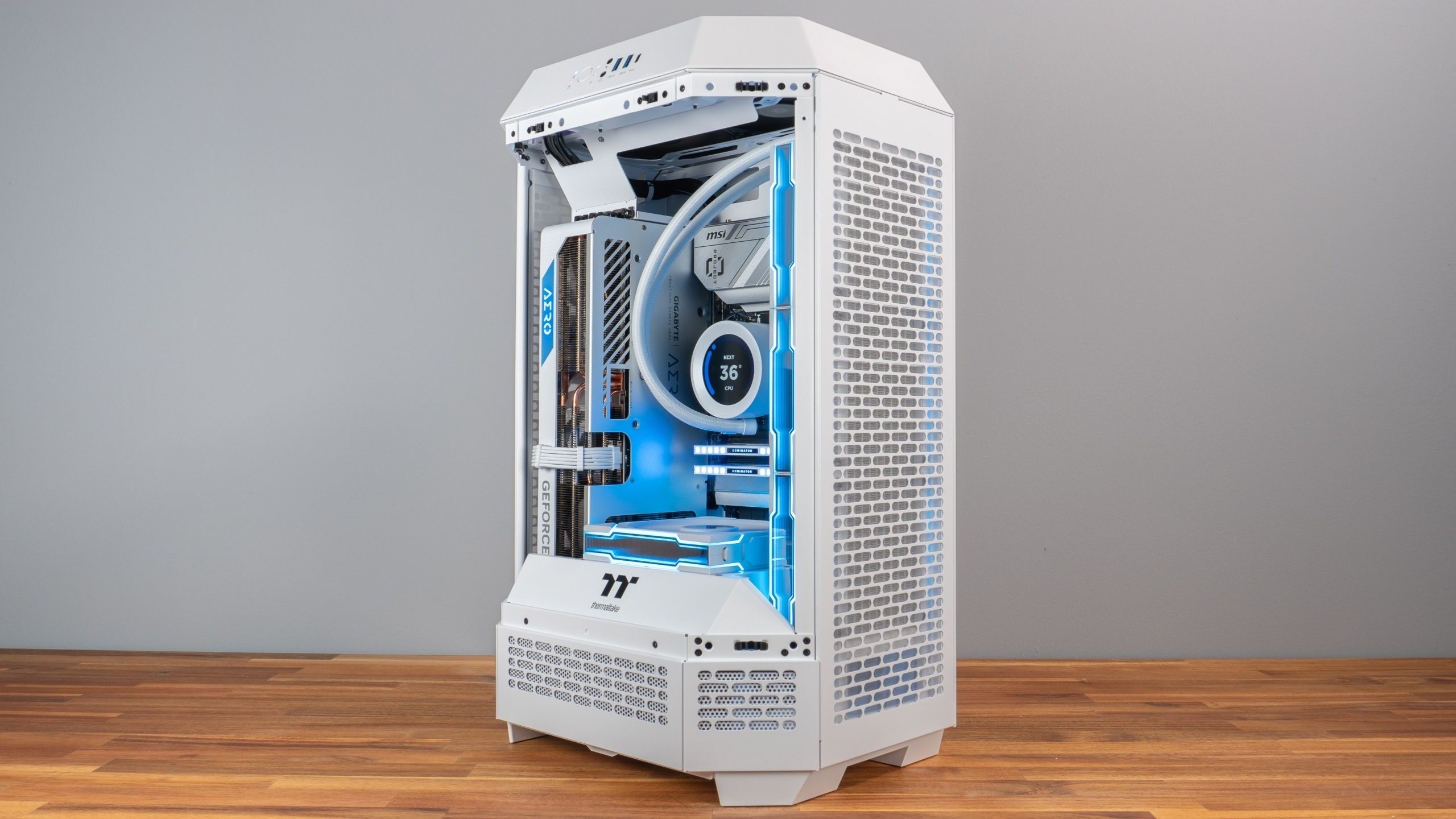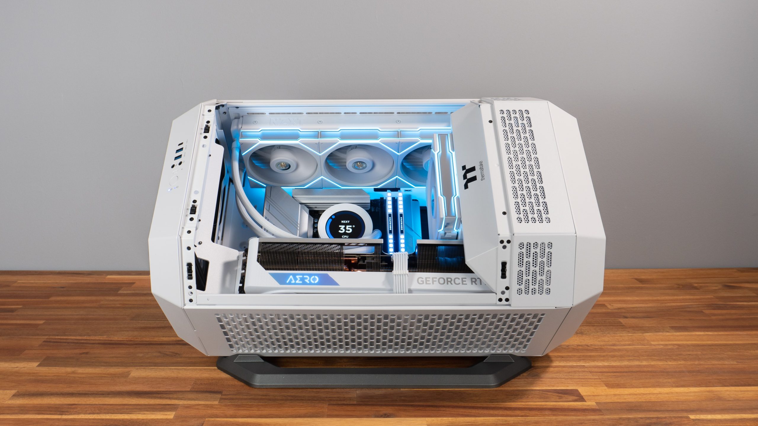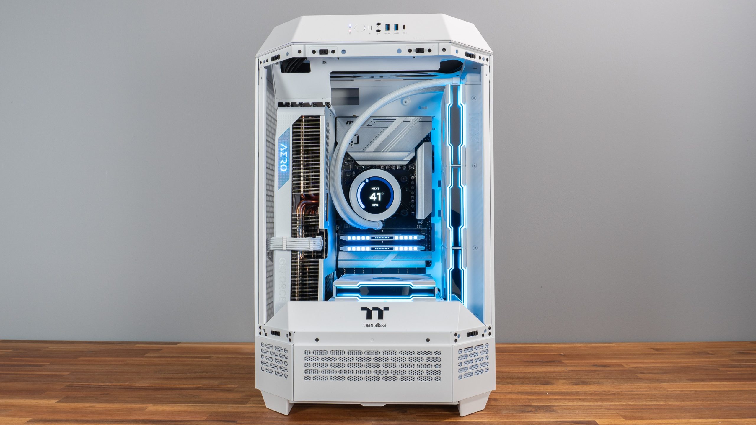 | Esthétisme | RGB sur ventilateurs, CPU & RAM Câbles tressés blancs RAM Corsair Dominator Platinium Thème blanc Ventilateur Lian Li blanc avec RGB sur le contour mais pas sur les pâles |